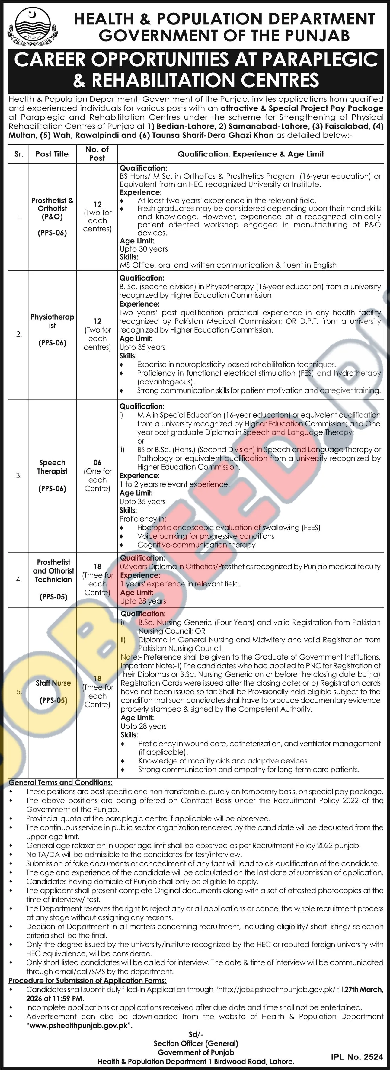 Government of Punjab's Health & Population Department announces career opportunities at its Paraplegic and Rehabilitation Centres. Seeking qualified individuals for roles including Nurse, Physiotherapist, and Prosthetist. These positions are based in various Punjab locations and offer a special project pay package. Ideal for those pursuing government jobs in Pakistan, particularly in the healthcare sector. Explore public sector employment and contribute to specialized patient care services.