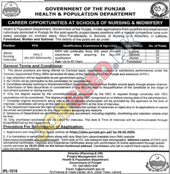 Government of Punjab Health & Population Department announces career opportunities for qualified individuals in nursing. Seeking experienced Senior Nursing Instructors for post-specific project-based positions on a contract basis. This government sector role offers a competitive lump sum salary and is ideal for those looking for stable employment and professional growth in Punjab, Pakistan. Explore latest government jobs and apply for nursing vacancies.