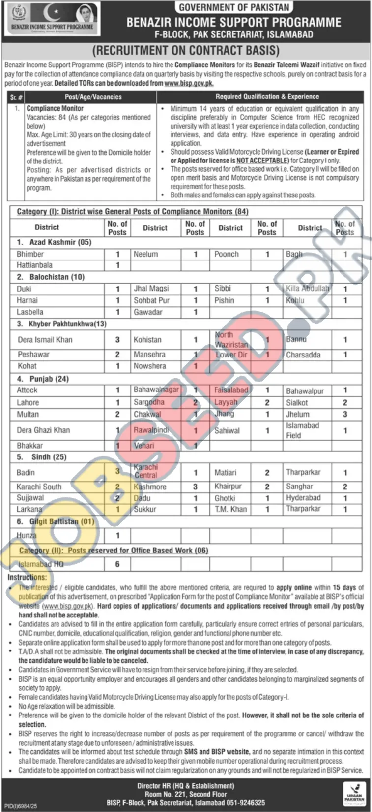 - Download the prescribed "Application Form for the post of Compliance Monitor" from BISP's official website (www.bisP.gov.pk).