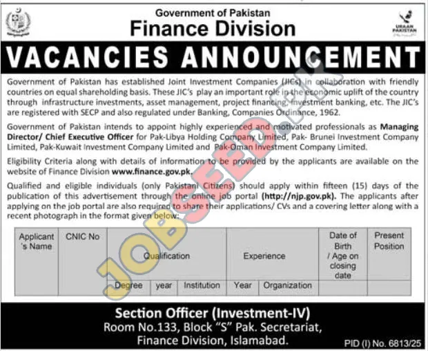 Government of Pakistan Finance Division is announcing vacancies for experienced professionals to join its Joint Investment Companies (JICs). These roles are crucial for driving economic uplift through infrastructure investments, asset management, and project financing. This government sector opportunity is ideal for individuals seeking impactful career growth and a stable employment environment. The advertisement highlights opportunities for Managing Director/Chief Executive Officer positions within associated investment companies.