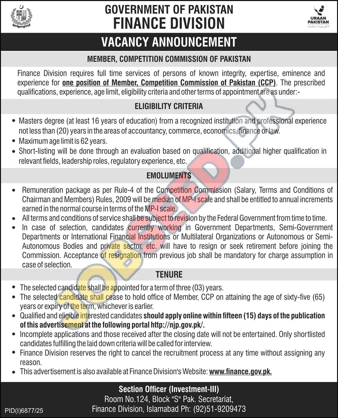 | Job Hiring Organization: | Finance Division, Government of Pakistan |