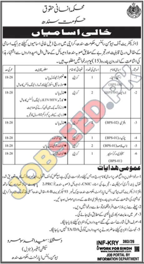 The Directorate of Human Rights, Government of Sindh, is pleased to announce a significant recruitment drive for various positions within its Karachi office. This is an excellent opportunity for individuals seeking stable government employment and career progression in the public sector. The department is looking for dedicated and qualified candidates to fill essential roles, contributing to the effective functioning of human rights initiatives in the province.