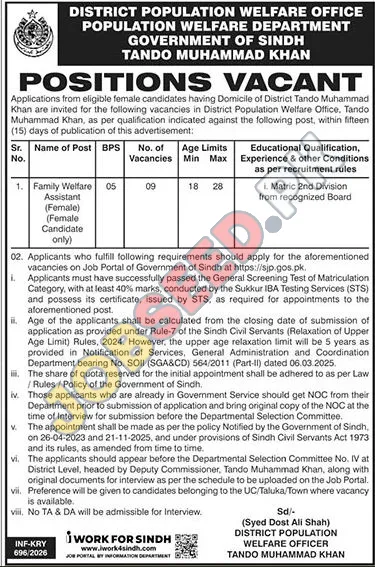 Government of Sindh is hiring for Family Welfare Assistant roles in Tando Muhammad Khan. This public sector employment opportunity is specifically for female candidates holding a domicile in the district. The position requires a Matriculation qualification and offers a chance for professional growth within the Population Welfare Department. Learn about the application process and eligibility criteria for these government jobs. This position represents excellent Assistant vacancies Tando Muhammad Khan in the region.