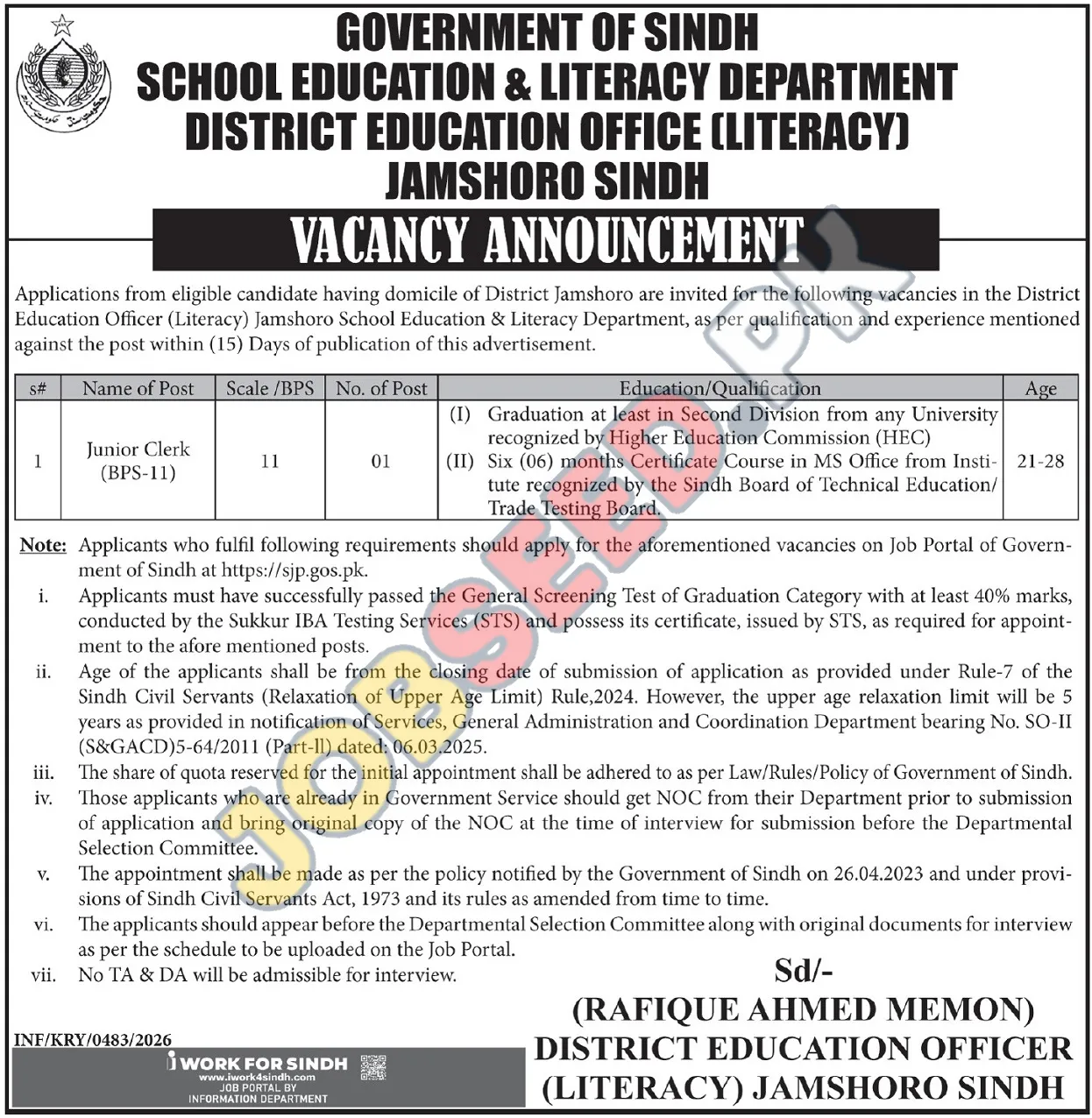 The Government of Sindh, through the School Education & Literacy Department, District Education Office (Literacy) Jamshoro, is offering valuable career opportunities for individuals seeking employment in the public sector. This announcement highlights vacancies for the position of Junior Clerk (BPS-11), specifically targeting candidates who are residents of District Jamshoro.