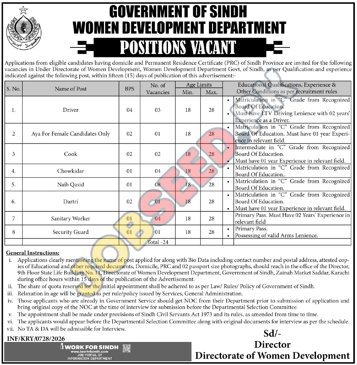 - Submit applications to the office of the Director, Women Development Department, Government of Sindh, Zainab Market Saddar, Karachi within 15 days of the advertisement's publication.