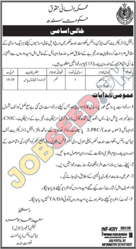 - 📩 Submit the complete application package to the following address: Regional Director Office, Human Rights Department, First Floor, Commissioner Office, Military Road, Sukkur.