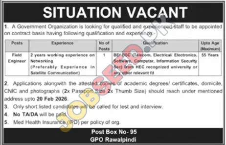This government organization is actively recruiting for a Field Engineer position on a contract basis. The role requires a minimum of 2 years of experience in networking, with a preference for expertise in satellite communication. Essential qualifications include a BE/BSC degree in Telecom, Electrical/Electronics, Computer Science, or Information Security from a recognized university. This position represents excellent Government Organization jobs in Rawalpindi in the region. This is a significant opportunity for individuals seeking government sector jobs in Rawalpindi, offering a clear career path and valuable experience. The application deadline is February 20, 2026. Additionally, Latest Government Organization careers are available for qualified candidates.
