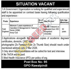 Government organization hiring for Field Engineer positions on a contract basis. Candidates must possess a minimum of 3 years of operational and management experience in Telecom (GSM), Army, or Civil sectors. Required qualification is a BS/BE in Telecom or equivalent from a recognized institution. This role offers a chance to engage in significant projects within the public sector, providing valuable experience and career advancement. Explore government employment opportunities in Rawalpindi for experienced engineers. Additionally, career development are available for qualified candidates.