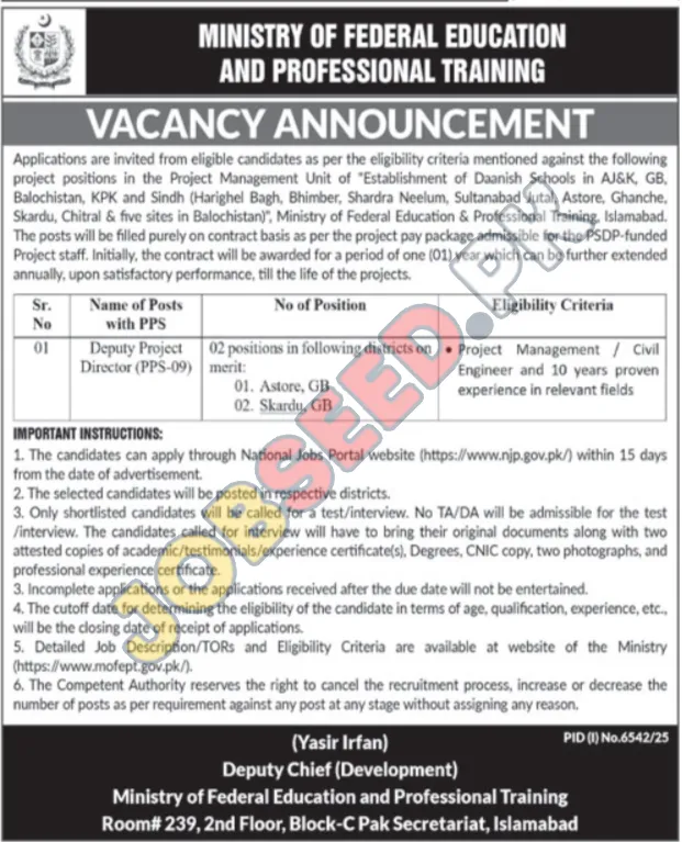 The Ministry of Federal Education and Professional Training is actively recruiting for a key role within its Project Management Unit. This government organization is offering a significant opportunity for experienced professionals to serve as a Deputy Project Director (PPS-09). This position is integral to the "Establishment of Daanish Schools" initiative, a vital national project aimed at enhancing educational infrastructure.