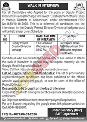 The S&IT Department, Government of Balochistan, is announcing a walk-in interview for the critical role of Deputy Project Director/Divisional Incharge. This position is integral to the 'Establishment of Safe Cities' project, a significant initiative aimed at enhancing urban safety across various districts of Balochistan. This government job offers a unique platform for professionals to contribute to public service and advance their careers within the public sector.
