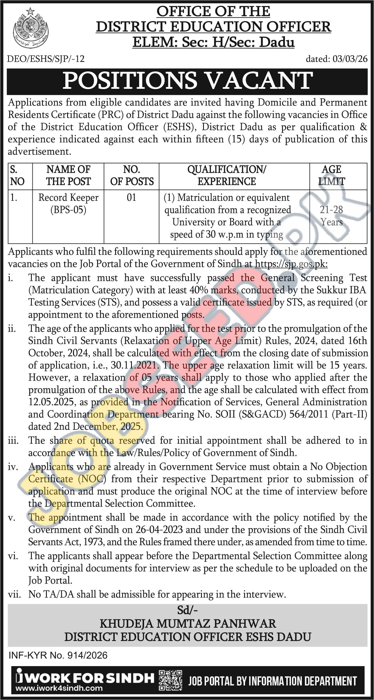 The Office of the District Education Officer (ESHS), District Dadu, is actively seeking applications for the position of Record Keeper. This is a significant opportunity for individuals looking to establish a career within the government sector in Pakistan. The role is ideal for those who possess a strong organizational aptitude and are detail-oriented.