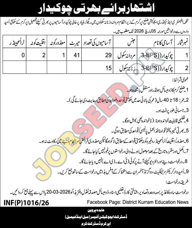 | 1 | Chowkidar (Male) | Male | 41 | Matric | 18-40 Years | BPS-3 |