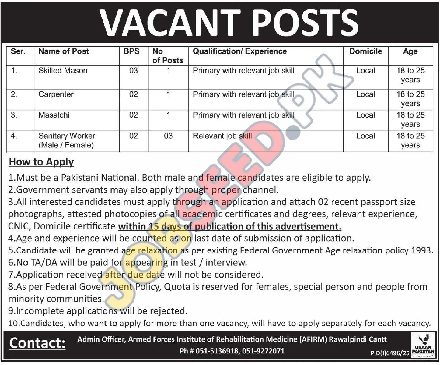 Federal government employment openings at the Armed Forces Institute of Rehabilitation Medicine (AFIRM) Rawalpindi Cantt. Seeking Pakistani nationals for roles requiring primary education and relevant job skills. Explore public sector career paths with opportunities for growth and stability. This advertisement highlights vacancies for Skilled Mason, Carpenter, Masalchi, and Sanitary Worker (Male/Female).