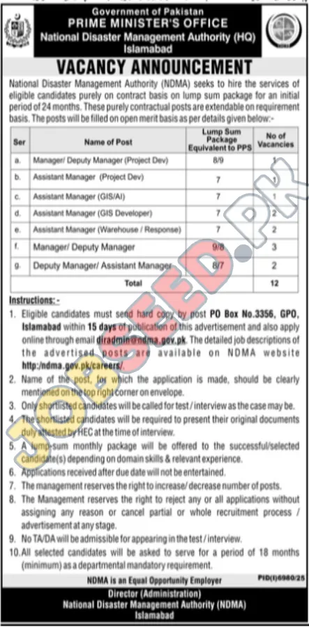 The National Disaster Management Authority (NDMA), a key government entity under the Prime Minister's Office, announces contract-based vacancies for managerial and assistant managerial positions in Islamabad. These roles are crucial for enhancing disaster response and management services. This is an excellent opportunity for individuals seeking government jobs in Pakistan, offering a structured career path and professional advancement. The positions are advertised on an open merit basis, ensuring fair selection for qualified candidates interested in public sector employment and contributing to national resilience.