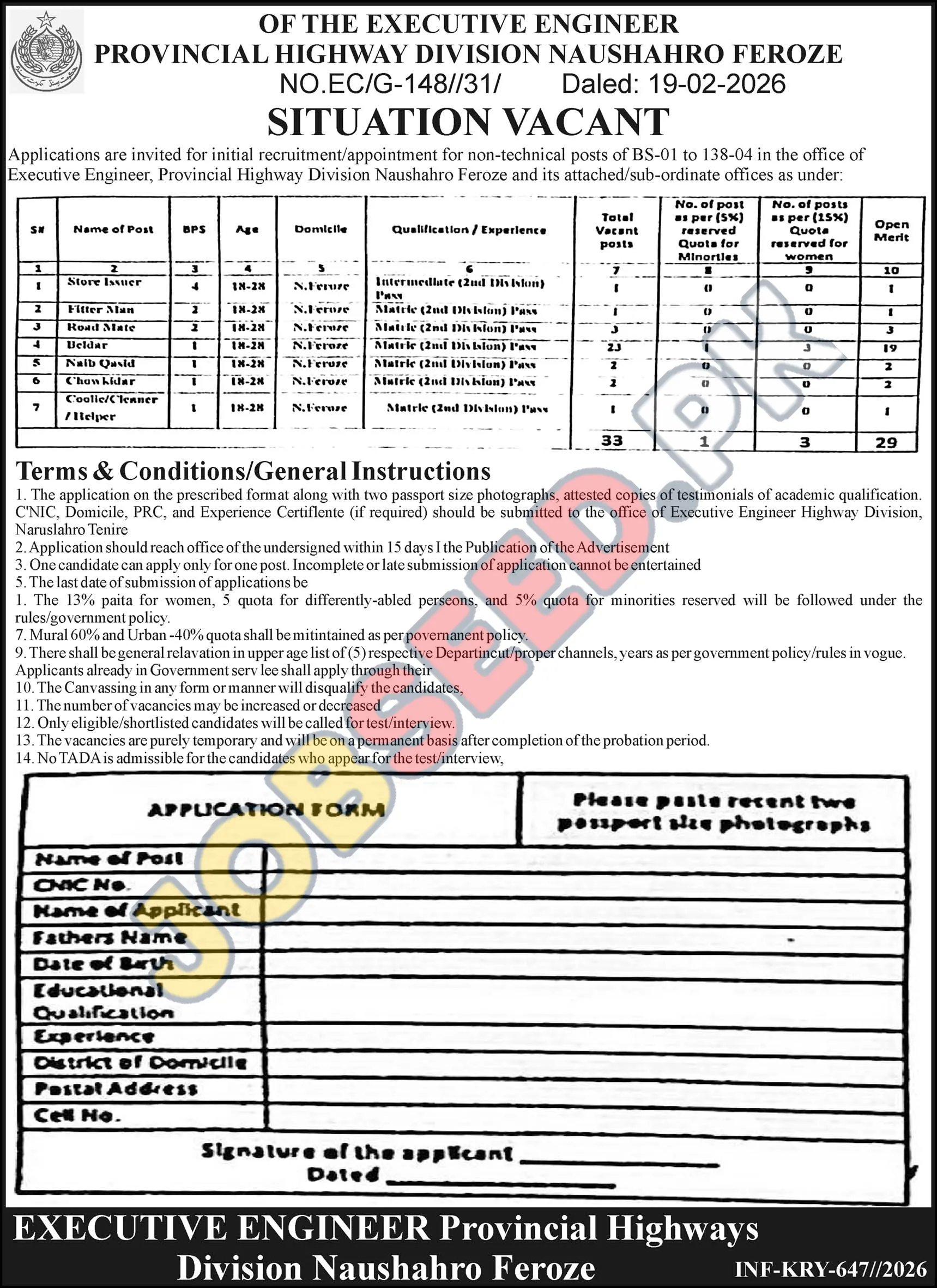 - Submission: Submit the complete application package to the office of the Executive Engineer, Provincial Highway Division, Naushahro Feroze.