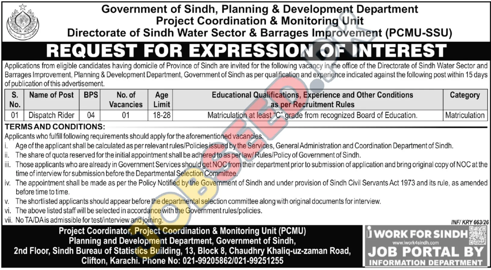 The Government of Sindh, Planning & Development Department, is offering a Dispatch Rider position within the Directorate of Sindh Water Sector & Barrages Improvement (PCMU-SSU). This is a great opportunity for those with a matriculation looking for government jobs in the public sector. Ensure that you meet the requirements and apply within the deadline.