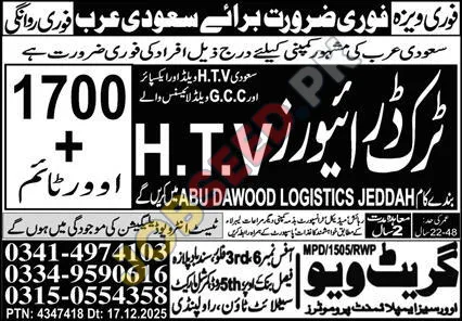 Great View Overseas Employment Promoter, Riyadh Saudi Arabia Pakistan invites applications from eligible candidates for the post of H.T.V Driver as per advertisement of 19 December, 2025, published in Express Newspaper. Matric educational qualification will be preferred.