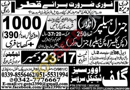 Gulf Overseas Technical Services, Doha Qatar Pakistan invites applications from eligible candidates for the post of General Helper (Indoor) and Kitchen Helper / General Worker as per advertisement of 17 December, 2025, published in Express Newspaper. Matric educational qualification will be preferred.