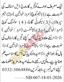 Join a reputable organization! We are hiring for multiple positions including Gym Coach, Gym Supervisor, Security Guard, Swimming Coach, and Receptionist. The available job roles require experienced professionals. We are also seeking experienced staff for the Paddle Tennis department. Candidates must possess the relevant experience and skills. Apply now for immediate consideration.