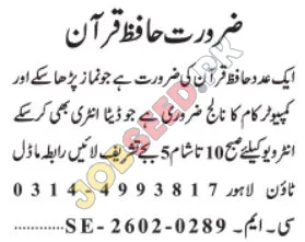 Hafiz-e-Quran Teacher and Data Entry Operator Vacancy in Lahore
