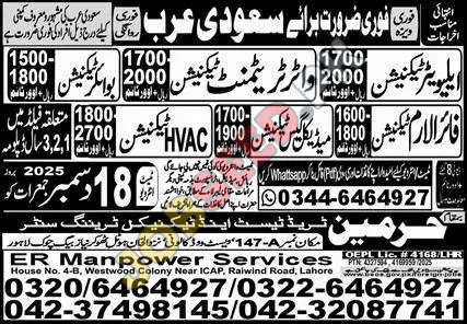ER Manpower Services is urgently seeking qualified technicians for various roles in Saudi Arabia. This is an excellent opportunity to join a well-known Saudi Arabian company. Attractive salary packages and additional benefits are offered.