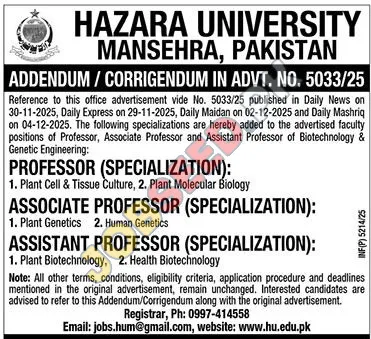 Hazara University, Mansehra, is expanding its esteemed faculty with exciting new positions in the Department of Biotechnology & Genetic Engineering. This addendum to Advertisement No. 5033/25 introduces opportunities for highly qualified individuals to join their academic team as Professor, Associate Professor, and Assistant Professor.