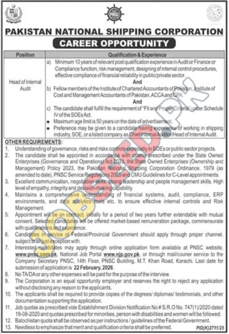 Pakistan National Shipping Corporation (PNSC), a well-regarded government organization, is presently offering a distinctive career opportunity for a Head of Internal Audit. This high-profile role requires professionals with a minimum of ten years of post-qualification experience in audit, finance, risk management, and compliance roles. As an internal auditor, you will play a crucial role in internal control procedures and ensure financial reliability. Join this leading public sector company and utilize your expertise to further your career.