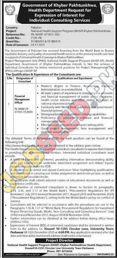 Health Department, Peshawar Khyber Pakhtunkhwa KPK Pakistan invites applications from eligible candidates for the post of Financial Management Officer as per advertisement of 27 November, 2025, published in Mashriq Newspaper. Master educational qualification will be preferred.