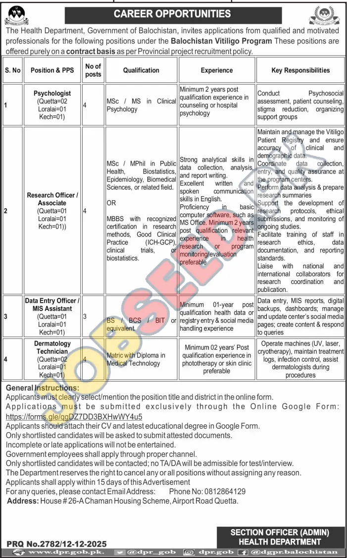Join the team at Health Department in Quetta, Balochistan. They are seeking to hire 4 qualified individuals for the roles of Psychologist, Research Officer, Data Entry Officer and Dermatology Technician. This is a TEMPORARY position. This career opportunity was advertised on 13 December, 2025. The last date to apply is 28 December, 2025. Don't miss this chance to advance your career with Health Department. For more information and to apply online, visit https://www.jobseed.pk.