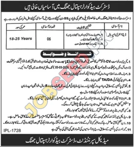 - Step 3: Submit Application by Deadline Applications, along with all required documents, must be submitted to the Medical Superintendent, District Headquarter Hospital Jhang, by March 05, 2026.