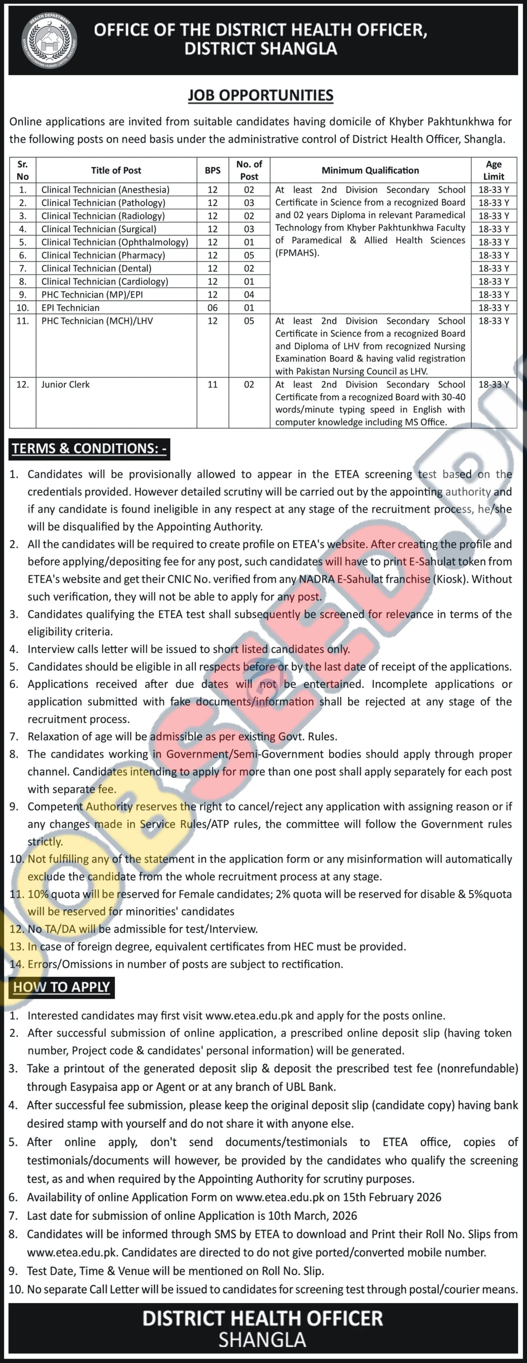 - Step 7: Last Date for Submission The final deadline for submitting your online application is 10th March, 2026. Explore these Technician jobs Shangla with competitive benefits. Applications submitted after this date will not be entertained.
