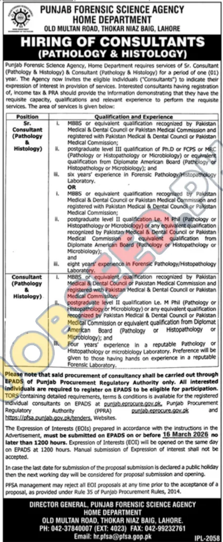 Hiring of Consultants: Pathology & Histology Experts for Punjab Forensic Science Agency