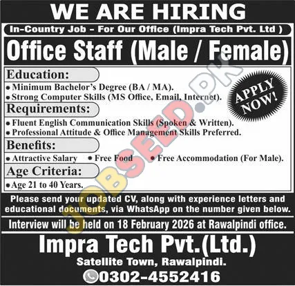 Imra Tech Pvt. Ltd. announces exciting career opportunities for Office Staff in Pakistan. This private sector organization is looking for candidates with a minimum Bachelor's degree and strong computer skills. Ideal applicants will demonstrate fluent English communication and professional office management abilities. Benefits include an attractive salary, free food, and free accommodation for male candidates. Additionally, Information Technology employment opportunities are available for qualified candidates. Explore these new job openings for professional growth and a rewarding career path.
