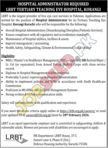 LRBT Tertiary Teaching Eye Hospital in Korangi Karachi is looking for a skilled Hospital Administrator. Become a part of a well-reputed medical institution offering free eye care services. The ideal candidate will oversee overall hospital administration, ensuring compliance with standards and managing utilities. This is a tremendous opportunity for those seeking medical employment in the healthcare industry. Apply today and embark on a rewarding career!