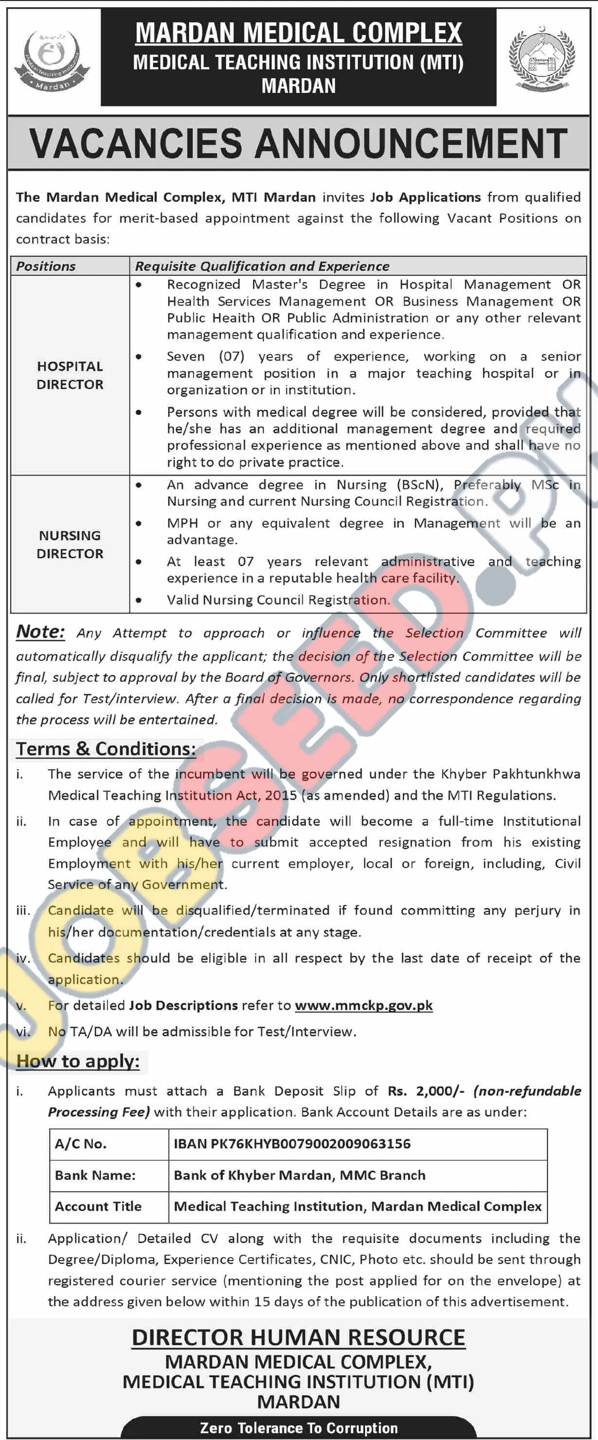 Hospital Director Positions Available at Mardan Medical Complex