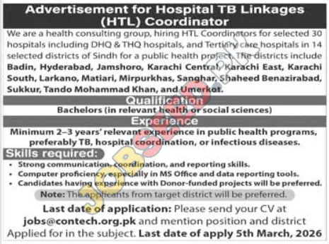 A prominent health consulting group is announcing exciting career opportunities for qualified professionals to serve as HTL Coordinators. This role is integral to a crucial public health project aimed at enhancing TB linkage services within 30 hospitals, including DHQ and THQ facilities, and tertiary care centers across 14 districts of Sindh. The project seeks to strengthen healthcare delivery and patient outcomes.