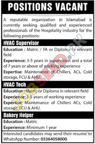 A distinguished organization operating within the vibrant hospitality sector in Islamabad is extending an invitation for skilled professionals to join their team. Successful candidates will benefit from these employment. This is an excellent opportunity for individuals seeking stable employment and career progression in a reputable private sector establishment. The available positions cater to specialized roles in HVAC maintenance and essential support functions.