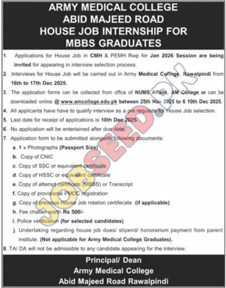 Army Medical College is now recruiting in Rawalpindi. Apply for the position of House Job Internship. The required qualification is MBBS. This role is within the Medical industry. A associate degree is preferred. The application process commenced on 30 November, 2025 via Dunya Newspaper. Interested and eligible candidates must submit their applications before the deadline on 10 December, 2025. This is a prime opportunity to join a renowned organization. For a step-by-step application guide and full eligibility criteria, please see the official advertisement on https://www.jobseed.pk.