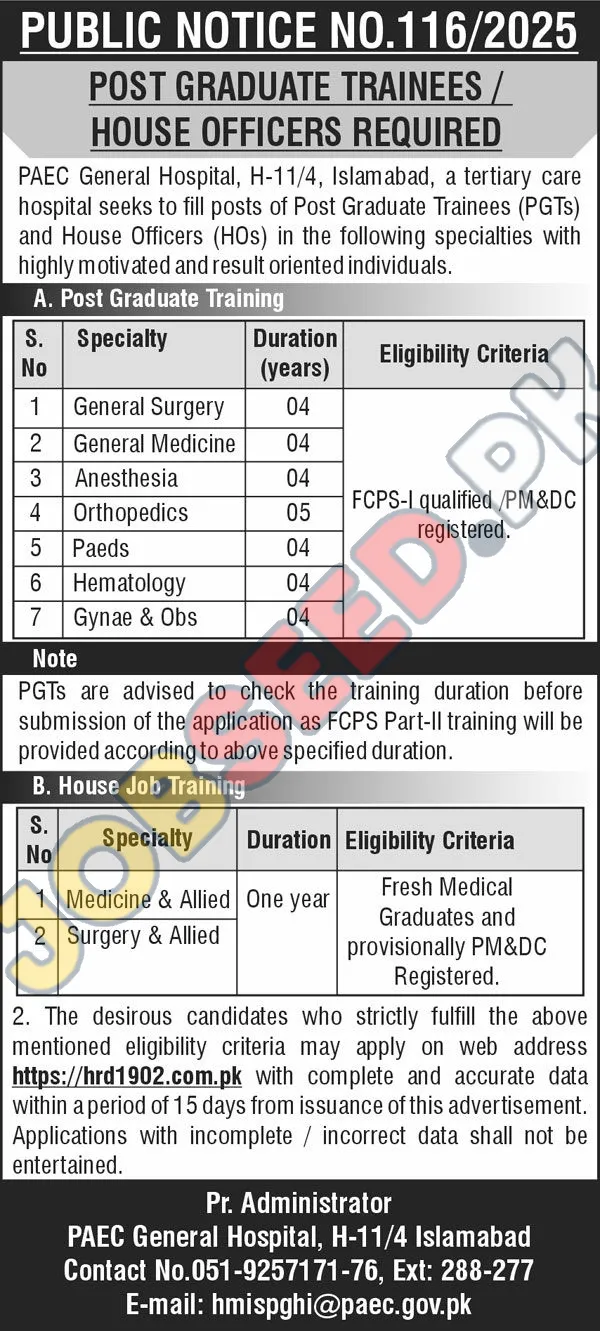 PAEC General Hospital is now recruiting in Islamabad. Apply for the position of House Officer. The required qualification is MBBS. This role is within the Medical industry. A associate degree is preferred. The application process commenced on 02 December, 2025 via Nation Newspaper. Interested and eligible candidates must submit their applications before the deadline on 17 December, 2025. This is a prime opportunity to join a renowned organization. For a step-by-step application guide and full eligibility criteria, please see the official advertisement on https://www.jobseed.pk.