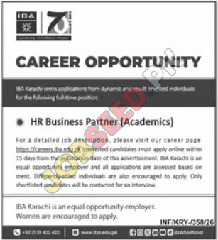 A leading educational institution, IBA Karachi, is actively seeking a dynamic and results-oriented professional to fill the role of HR Business Partner (Academics). This full-time position presents an excellent employment opportunity for individuals with a passion for human resources especially in academic setup. Successful candidates will play a crucial role in supporting the HR function within the institution. This private sector entity offers a competitive salary and encourages applications from diverse backgrounds. Apply now for this exciting career opportunity!
