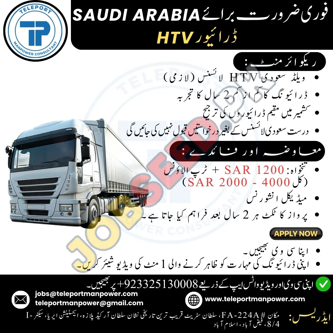 We are seeking skilled drivers for HTV positions in Saudi Arabia. The ideal candidate will have a valid Saudi HTV license and a minimum of two years' driving experience. Priority will be given to drivers residing in Kashmir. Don't miss this chance for a rewarding career in high-demand roles with excellent compensation. This position represents excellent best career opportunities in the region.