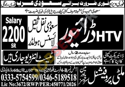 Multi Professional Services has announced immediate openings for experienced HTV drivers to work with a reputed company in Saudi Arabia. These opportunities offer immediate deployment for qualified candidates. This is a chance to start working with an attractive salary package and great benefits.