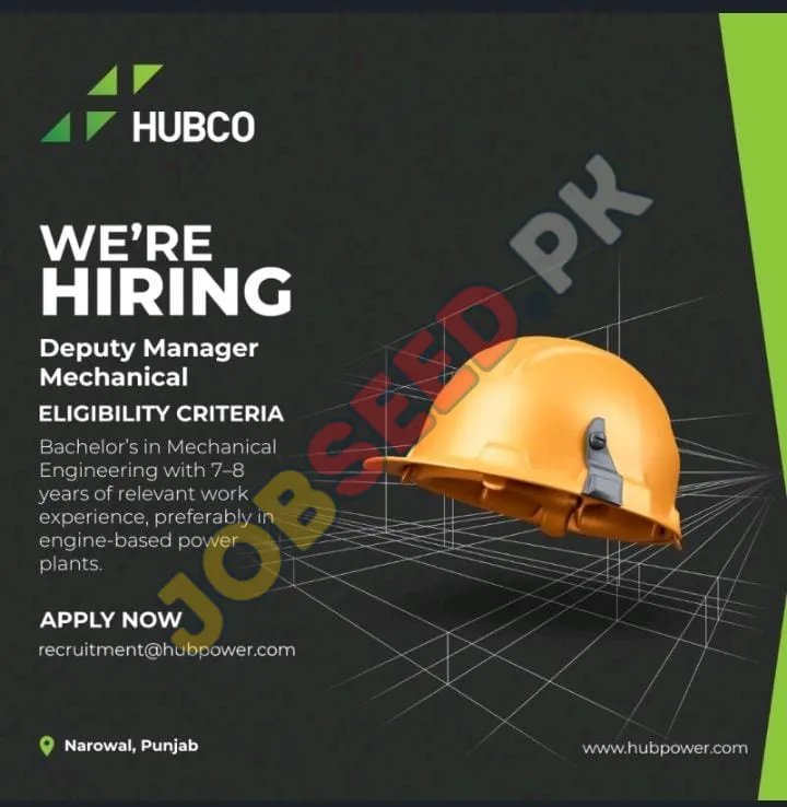 HUBCO, Narowal invites applications from eligible candidates for the post of Deputy Manager Mechanical as per advertisement of 21 December, 2025. BA educational qualification will be preferred.