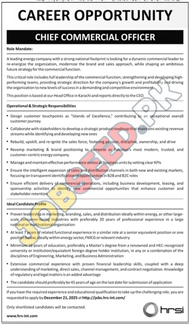 Human Resource Solutions International HRSI, Karachi Sindh Pakistan invites applications from eligible candidates for the post of Chief Commercial Officer as per advertisement of 07 December, 2025, published in Jang Newspaper. Master educational qualification will be preferred.