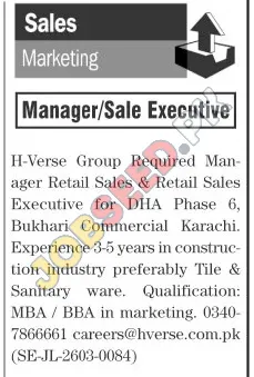H-Verse Group Hiring: Retail Sales Manager & Executive in DHA Phase 6, Karachi