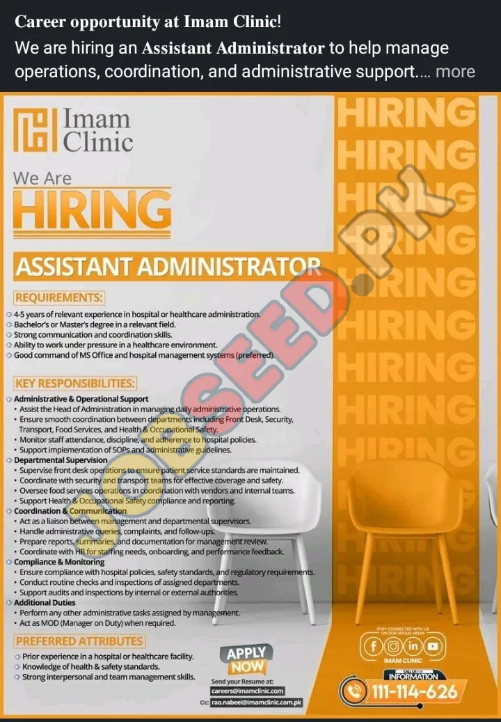 Imam Clinic is currently seeking applications for the position of Assistant Administrator, presenting a valuable career opportunity for experienced professionals in the healthcare sector. This role is crucial for ensuring the efficient operation and coordination of various hospital departments, including Front Desk, Security, Transport, and Food Services. Explore these private sector careers with competitive benefits. The successful candidate will play a key role in maintaining high standards of patient care and operational efficiency, contributing significantly to the clinic's overall success.