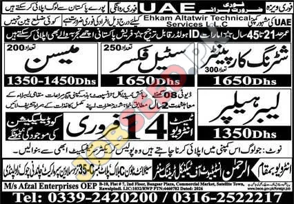 The advertisement seeks Carpenters, Steel Fixers, Labourers, and Masons for a prominent firm in the UAE. Pakistani nationals with UAE ID and those seeking labor jobs are encouraged to apply. Fresh applicants with experience are encouraged to apply. Explore the current openings for immediate employment, providing an exceptional career path in a thriving overseas market.