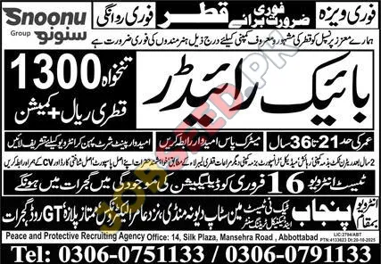 Peace and Protective Recruiting Agency is urgently hiring Bike Riders for a prominent company in Qatar. We are looking for talented individuals with relevant experience to join our team. This position represents excellent high salary jobs in the region. The selected candidates will receive a salary of 1300 Qatari Riyal plus commission, with additional benefits. This is a great opportunity to get hired in the public sector with career opportunities. Candidates must possess a Matric qualification and have experience in this field. Successful candidates will benefit from these career development.