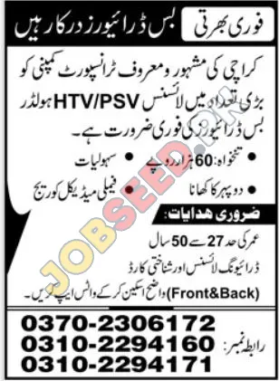 A well-known transport company in Karachi is seeking qualified Bus Drivers with HTV/PSV licenses. This private sector company is offering an exciting opportunity with a competitive salary and excellent benefits. Explore these career opportunities with competitive benefits. This is an excellent opportunity for professional growth with a great environment.