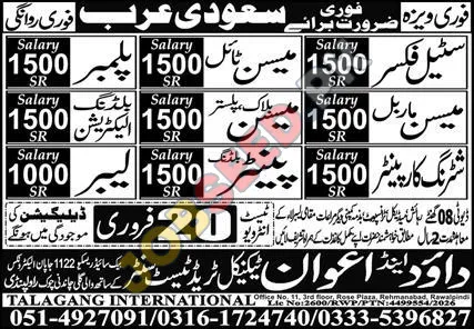 Talagang International is urgently recruiting skilled carpenters for immediate deployment to Saudi Arabia. This presents a fantastic employment opportunity for experienced professionals. Successful candidates will be offered a competitive salary package. The positions offers career advancement and provides the chance to work in a dynamic environment